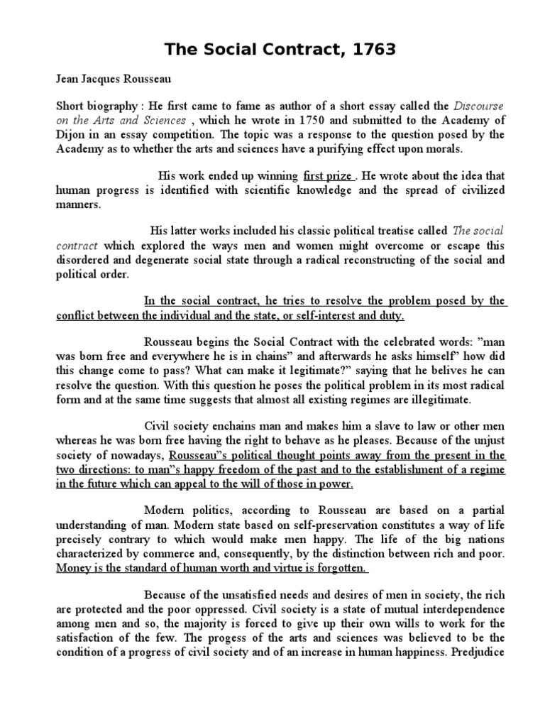 Rousseaus mother died soon after his birth. Up to 24 cash back Rousseau described the Social Contract as an understanding between all individuals. Rousseau then discusses how this contract serves as a foundation for a state that protects its citizens.